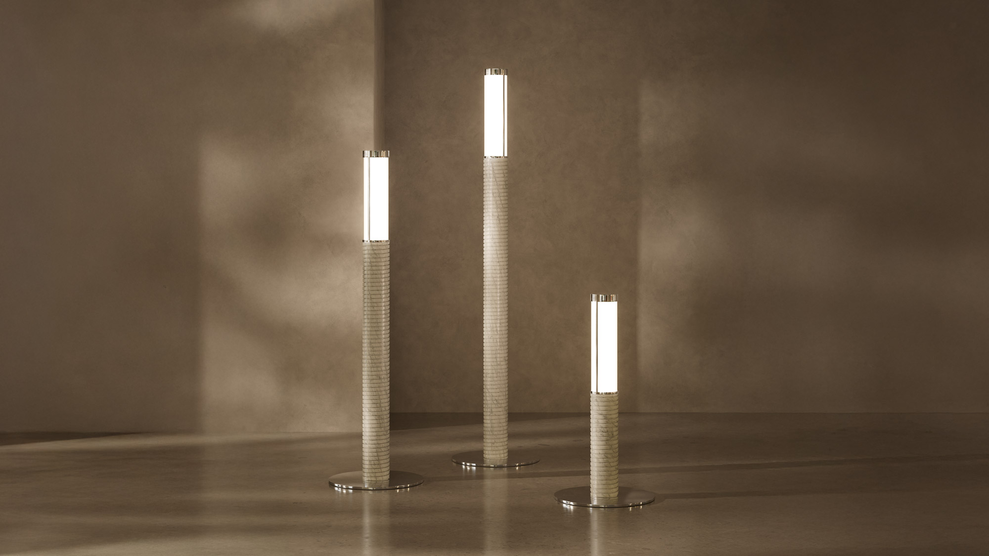 NEEDLE is a floor lamp that can rise to different heights based on different contexts of use, from hospitality to residential. Characterized by a circular metal base overcome by a textured marble cylinder and by a glass cylinder, this lamp diffuses light around itself just like a small lighthouse.